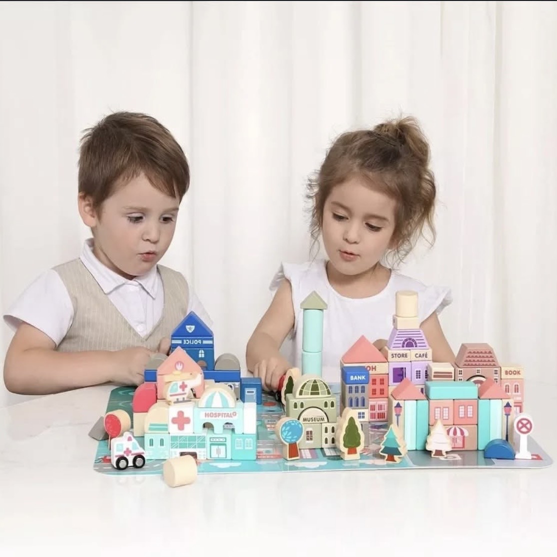 🤍 مقاساتها آمنة ومناسبة لقبضة يد الصغار.🤍 يقدر الطفل يبني بها مدينة متكاملة: بنك/مستشفى/شرطة/محطة إطفاء/فندق/سوبرماركت..🤍 يقدر الطفل يبني بها نماذج مختلفة من خياله.تحتوي على بزل يُستخدم كقاعده بشوارع وأساس المدينة.
